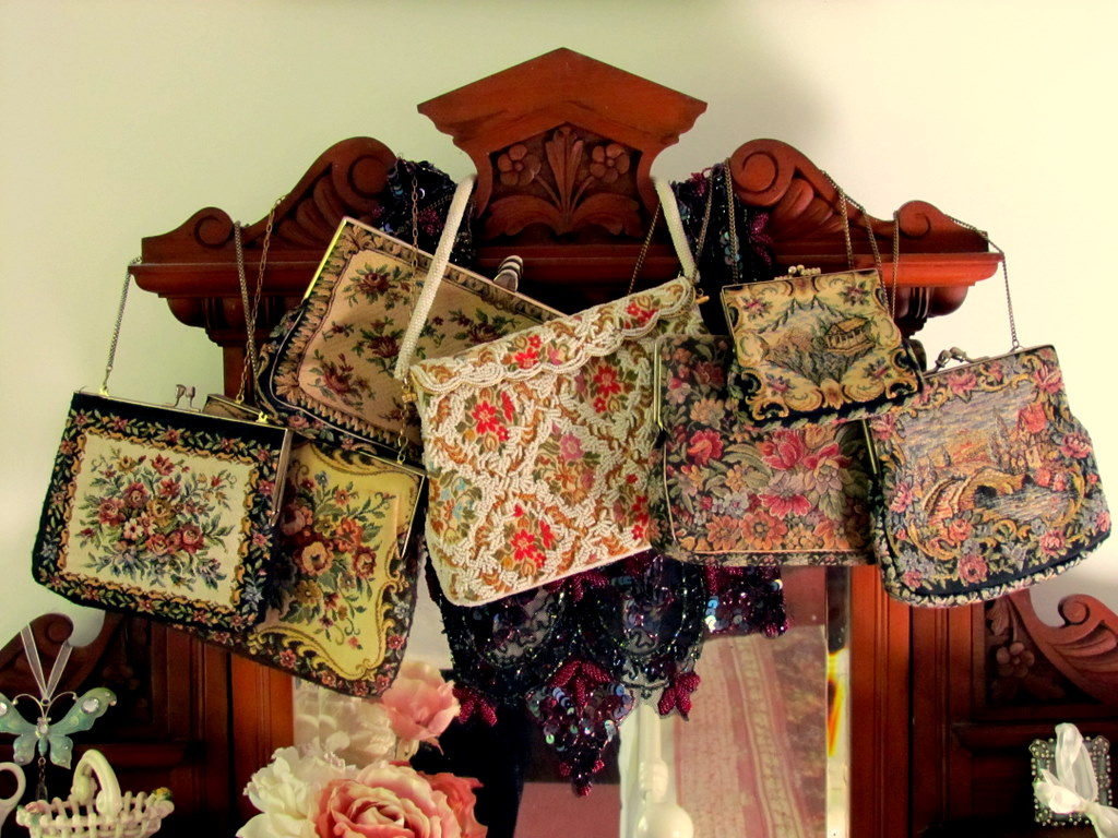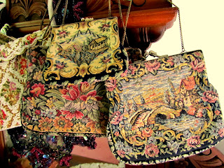 Vintage Tapestry Purses. These are usually lined with a satin fabric and hang on a gold chain.