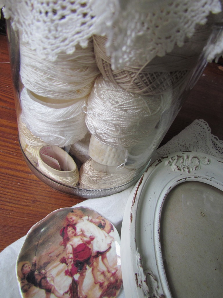 ReplyDeleteAll your acquired treasures are gorgeous esp the vintage laces. and the threads look lovely in the big glass bottle. x
