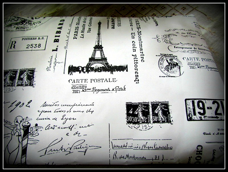 Hello my dear Suzy, You had such a wonderful swap with Shane. I love the French themed pages you created for her. They are just gorgeous. Shane's collages are so very beautiful as well. What a sweet idea to add a pocket to the back of one of them. You've sent each other lovely fabrics to create with as well.