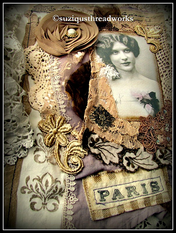 ReplyDeleteHow do you do it, Suzy, time after time, you create the most beautiful collages. So many layers, so many embellishments,all put together with such incredible flair and feel for the fabrics and laces. As always, I am in awe of your creations.