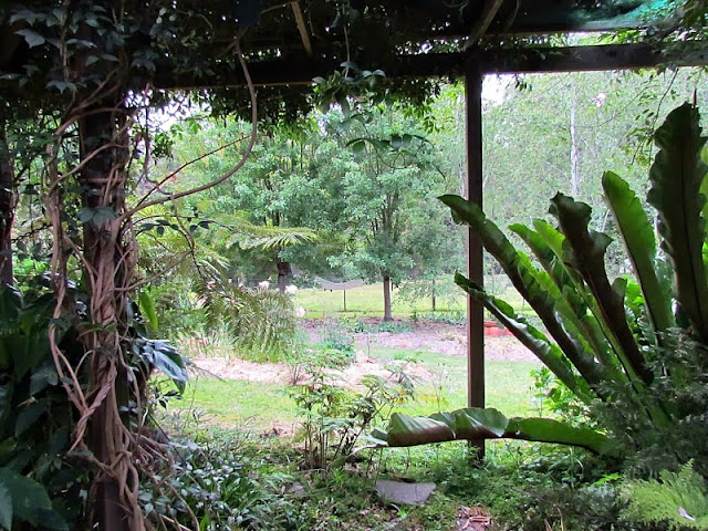 A view through a fernery from the kitchen window.