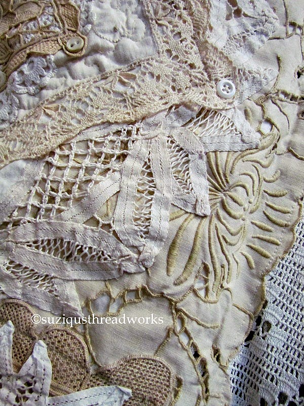 ReplyDeleteI love the way you have shown us how you have made your quilt/throw Suzy. I love the choices of different types of doily you have used and embroidered pieces. This is gorgeous, so much work involved and the addition of the buttons just the perfect touch. Jx