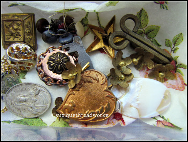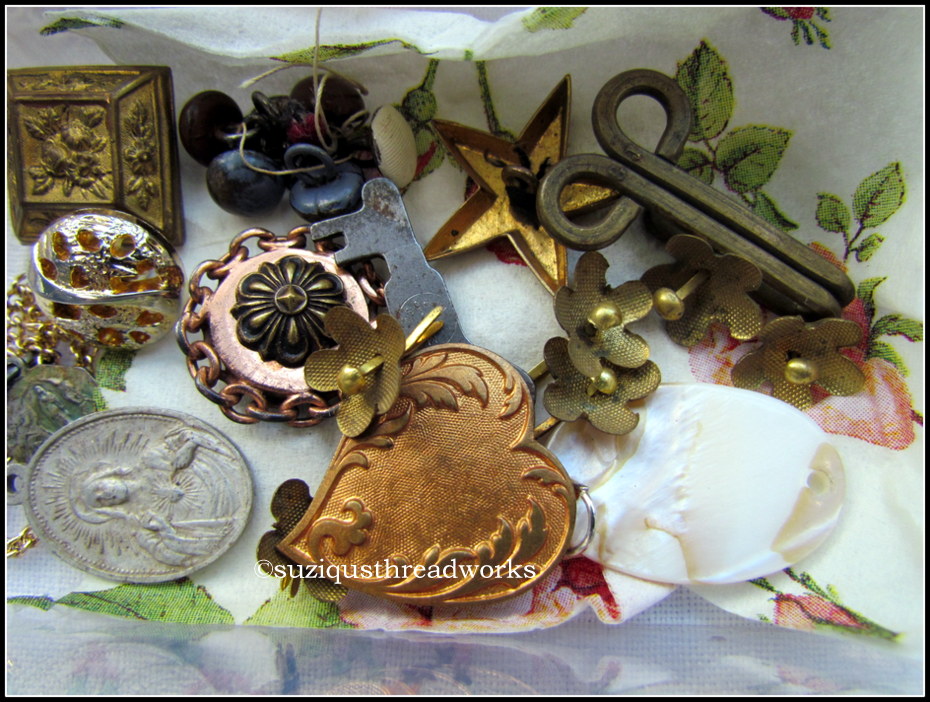 a dear little package containing medals, beads, crucifixes,
